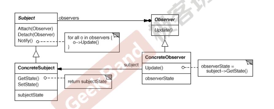 • ConcreteSubject和ConcreteObserver是系统是变化的部分