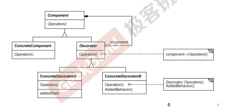 Decorator类在接口上表现为is-a Component的继承关系,即Decorator类继承了Component类所具有的接口.但在实现上又表现为has-a Component的组合关系,即Decorator类又使用了另外一个Component类.