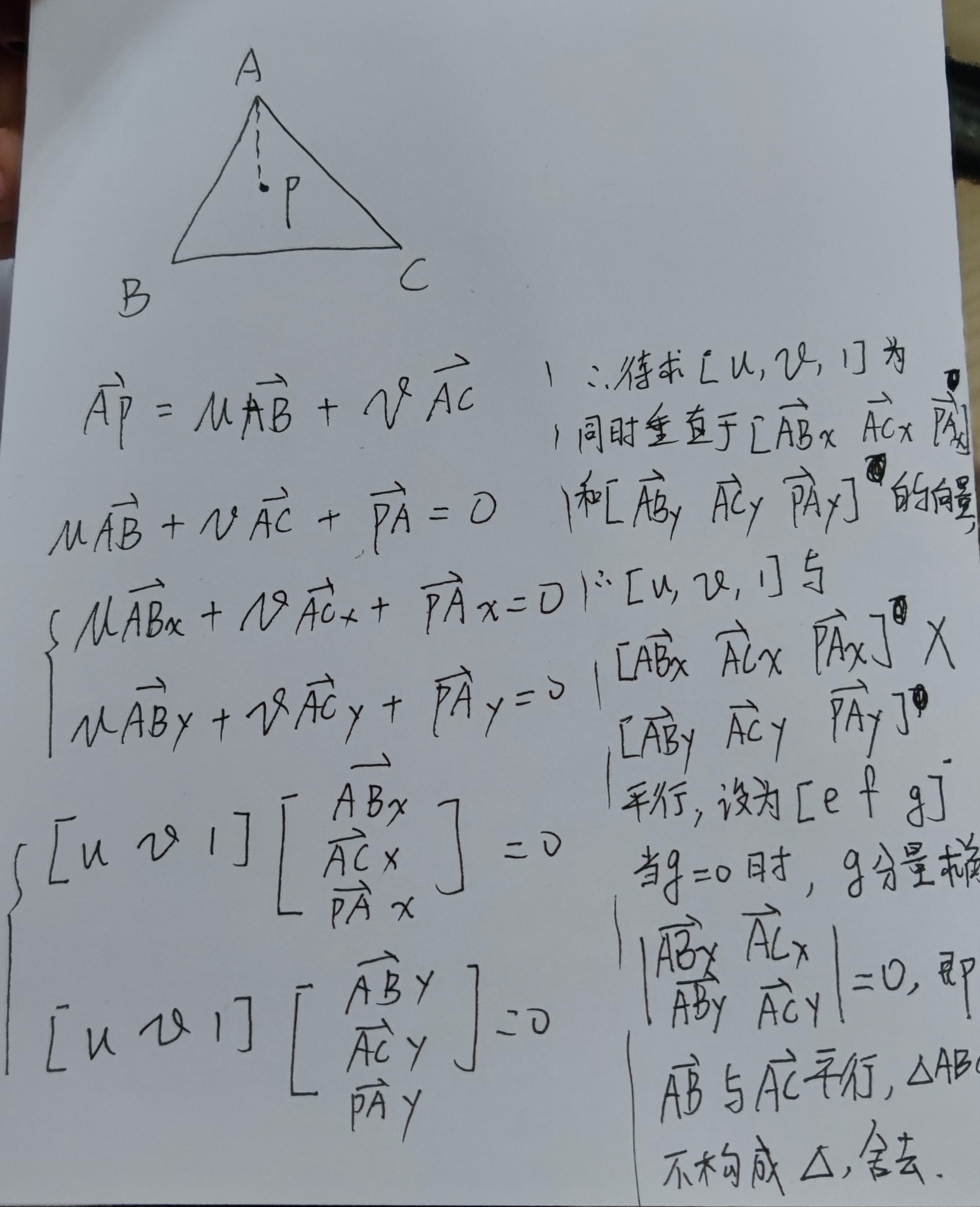 - 如果对应向量全在另外一条向量的同一层,则改点在三角形内部.否则在三角形外部.