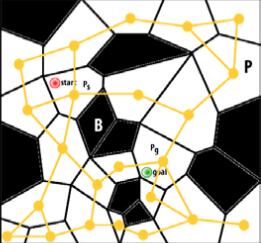 黑色是不可通过的地块,黄点是每个地块的中心点,黄线是将每个可通过地块的中心点进行了连接